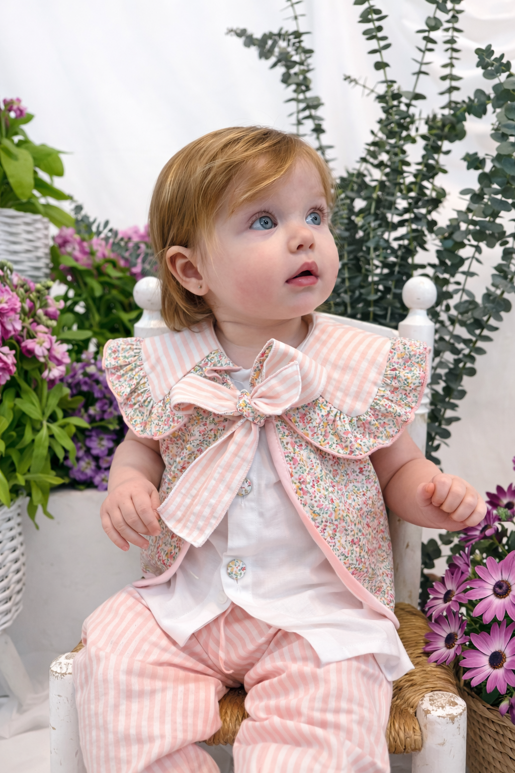 Blusa Begur en batista blanca con cuello maxi combinado en rayas y liberty, los botones van forrados en el mismo tejido haciéndola todavía más especial.