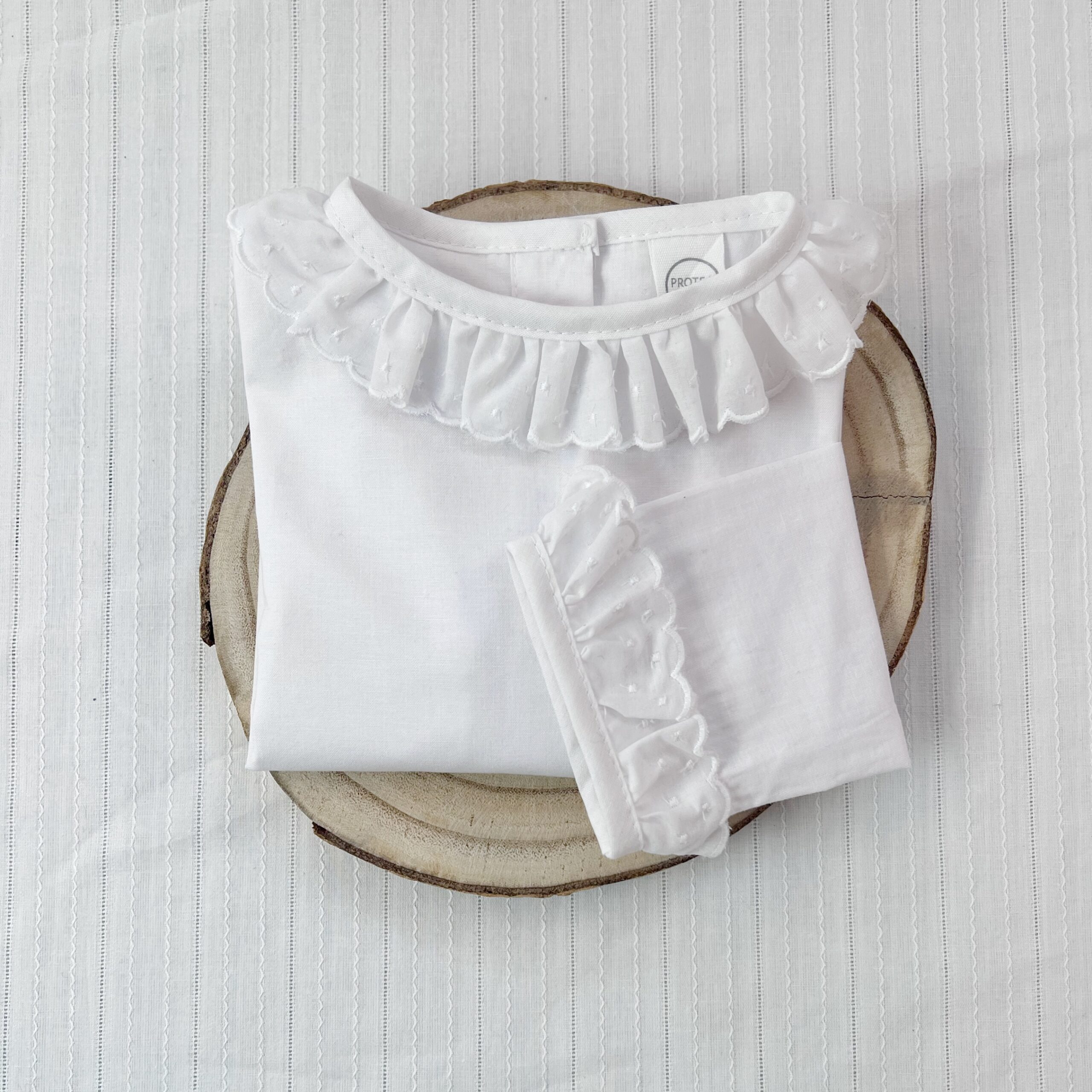 Blusa en batista blanca con blonda en cuello y puños, un modelo perfecto para poner debajo del un jersey básico para darle un toque especial.