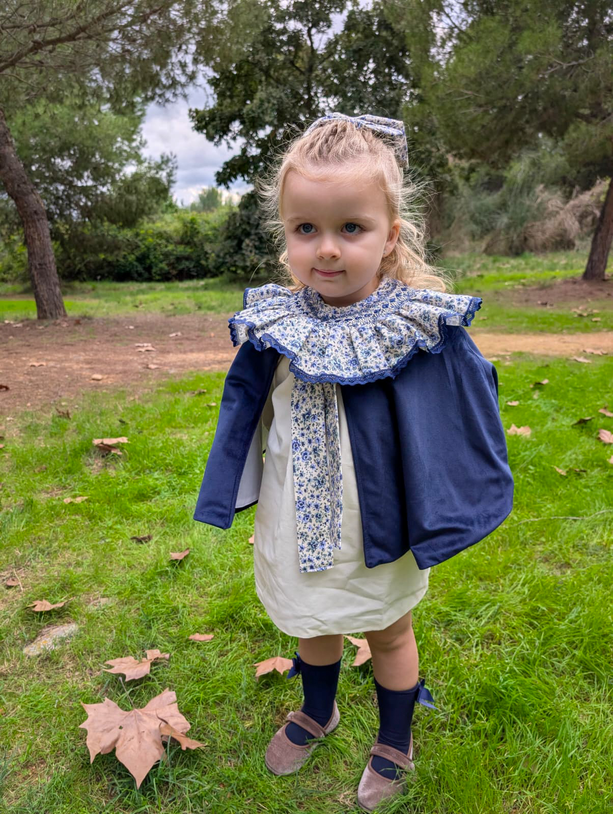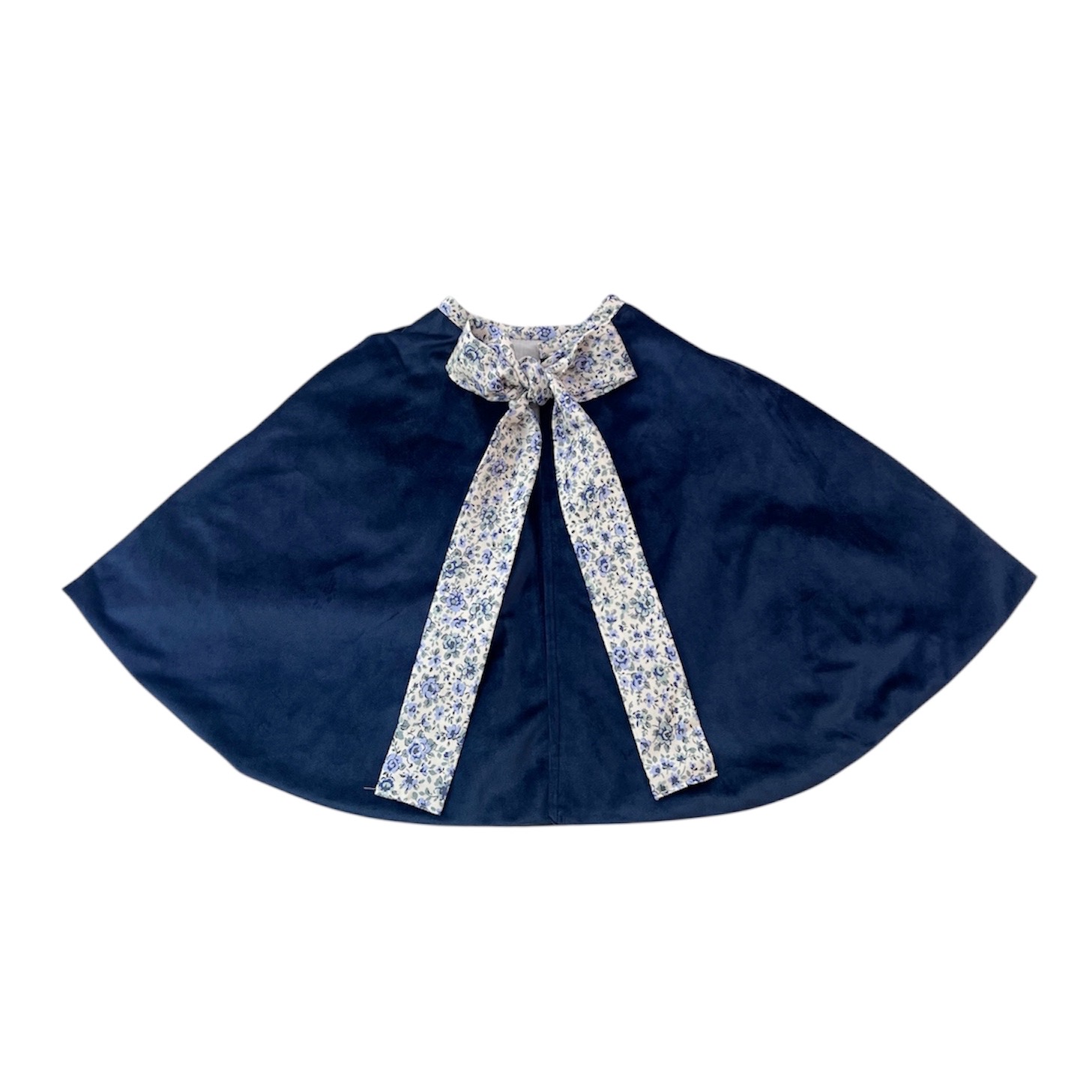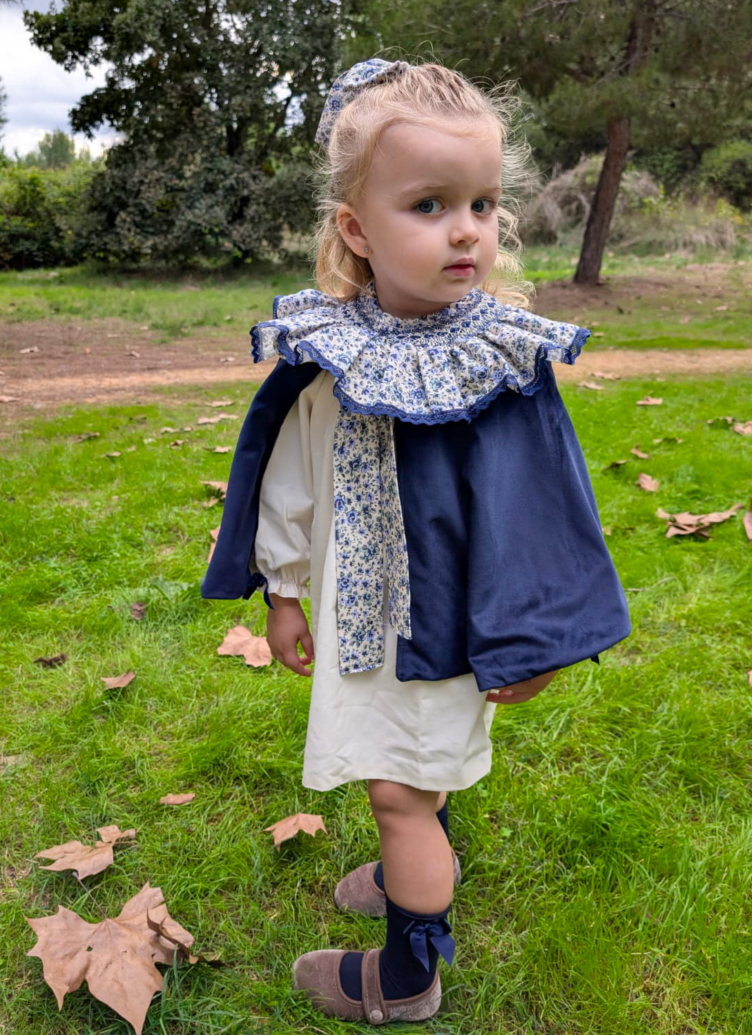 Capa en terciopelo azul marino con lazada en tejido Lyon. Una prenda muy especial con la que tu peque no pasará desapercibida estas navidades.