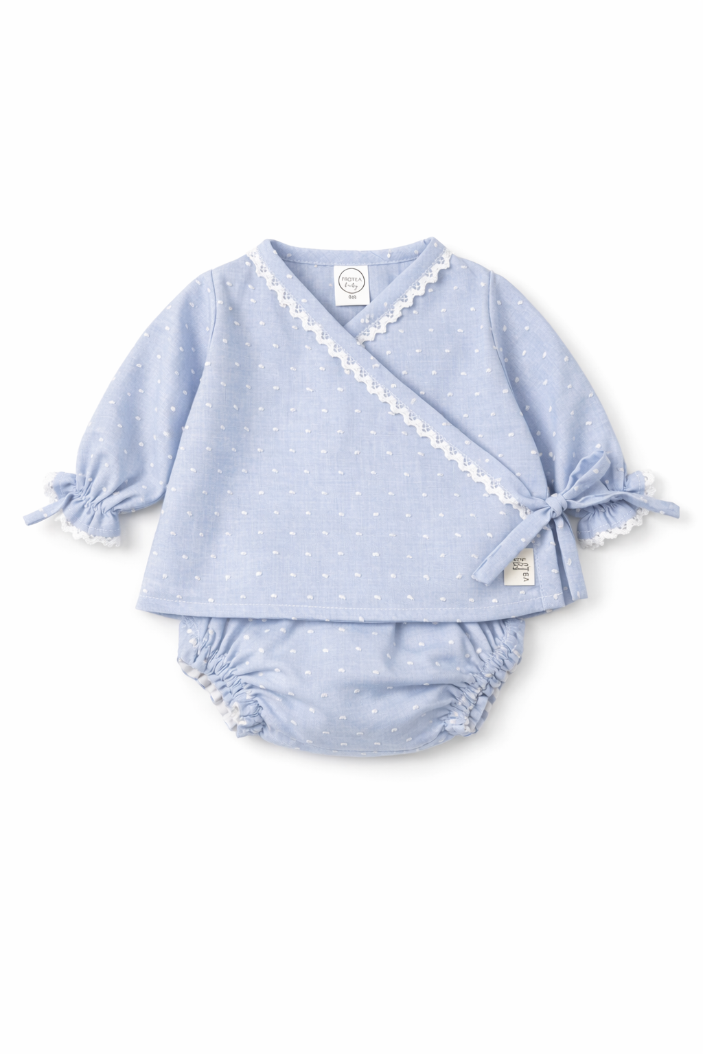 Conjunto compuesto por jubón con cierre de lazo cruzado y braguita a juego. Una opción perfecta para primera puesta en primavera y verano. Con posibilidad de bordar el nombre el color blanco, a juego con la puntilla.