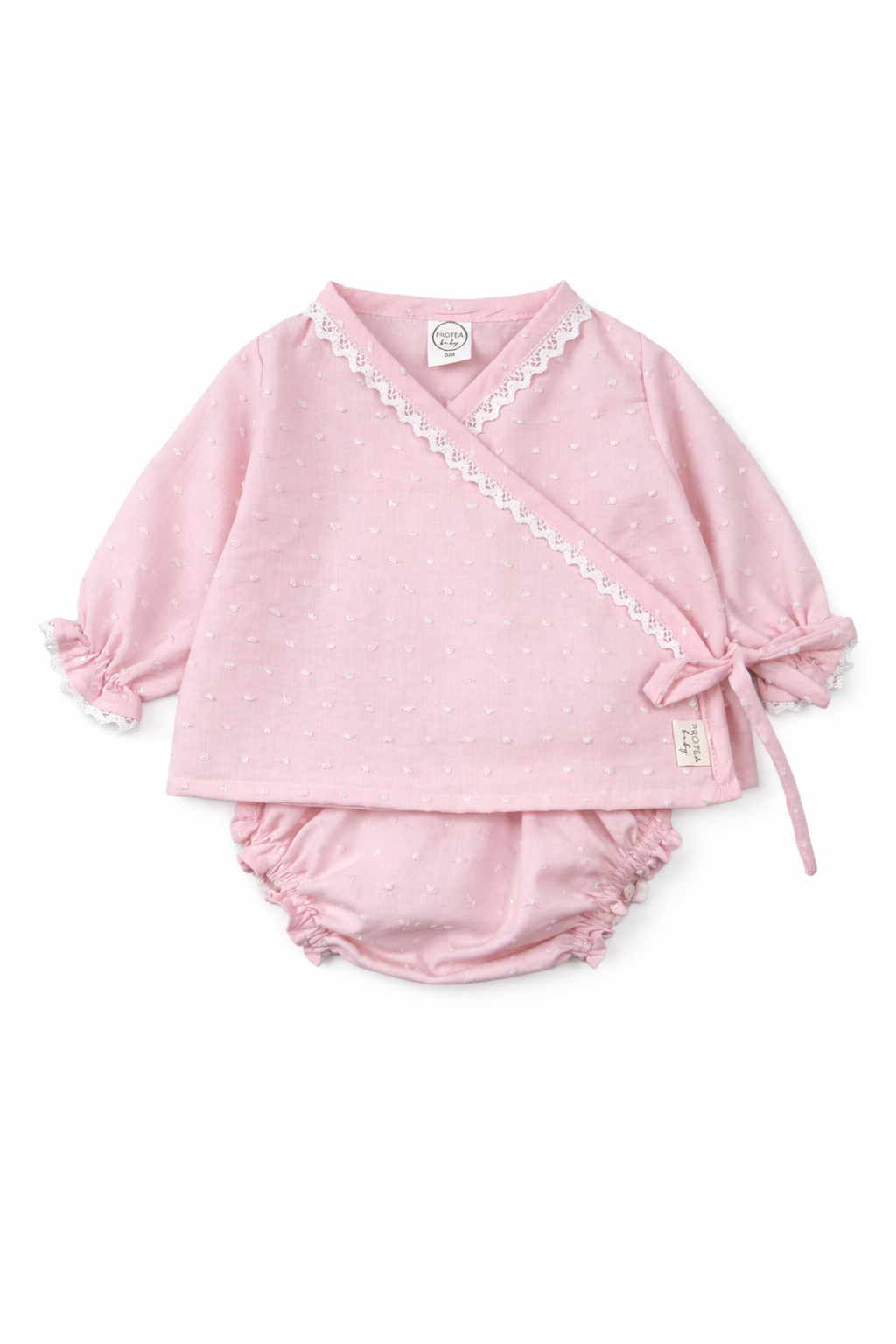 Conjunto compuesto por jubón con cierre de lazo cruzado y braguita a juego. Una opción perfecta para primera puesta en primavera y verano. Con posibilidad de bordar el nombre el color blanco, a juego con la puntilla.