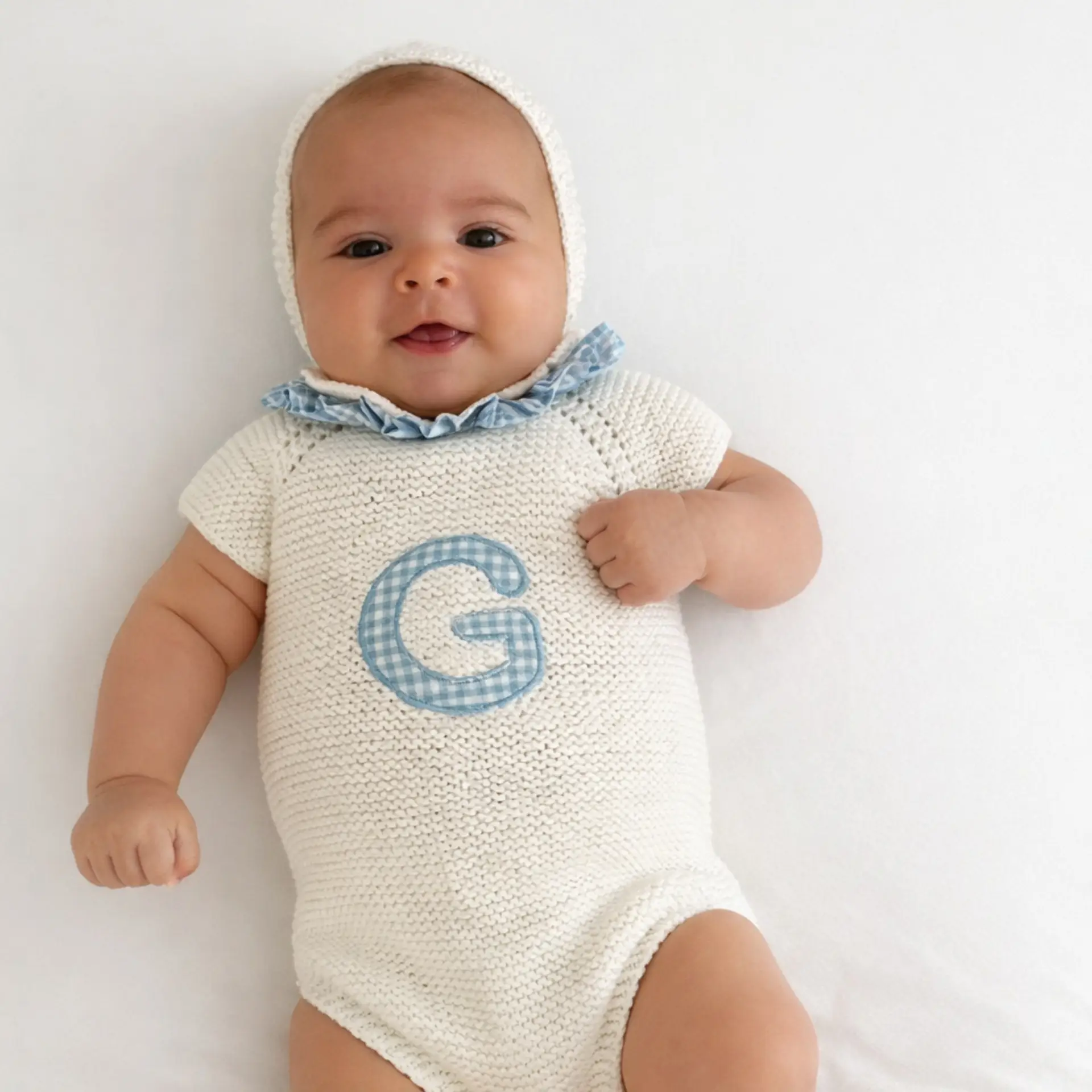 Conjunto con Pelele personalizado con inicial y cuello en vichy a elegir, capota y patucos con lazada al tono. Un conjunto ideal para este verano!