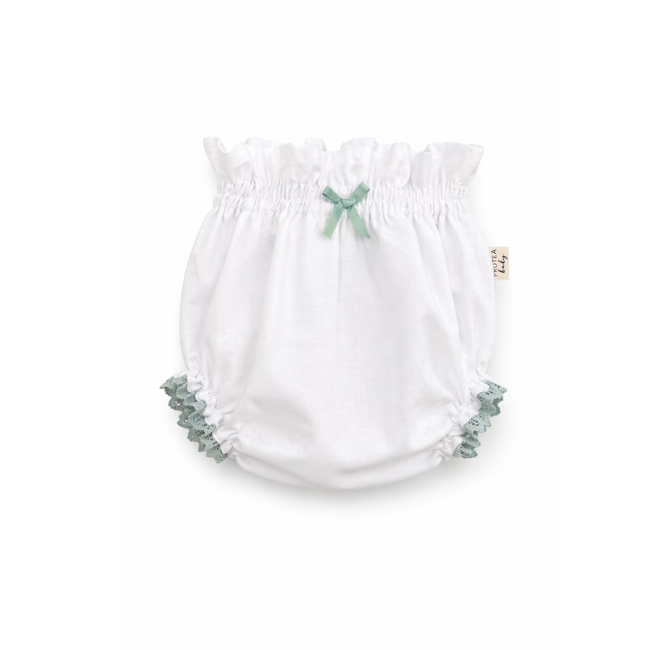 Culotte de tiro alto en batista blanca con puntilla y lazo en verde mint, va totalmente forrado con las gomas escondidas, de tal manera que no apriete ni haga roce. Totalmente unisex.
