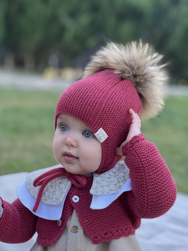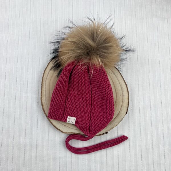 Gorro tejido a mano en lana 100% merino, el pompón es de pelo natural y extraíble, va con corchetes.