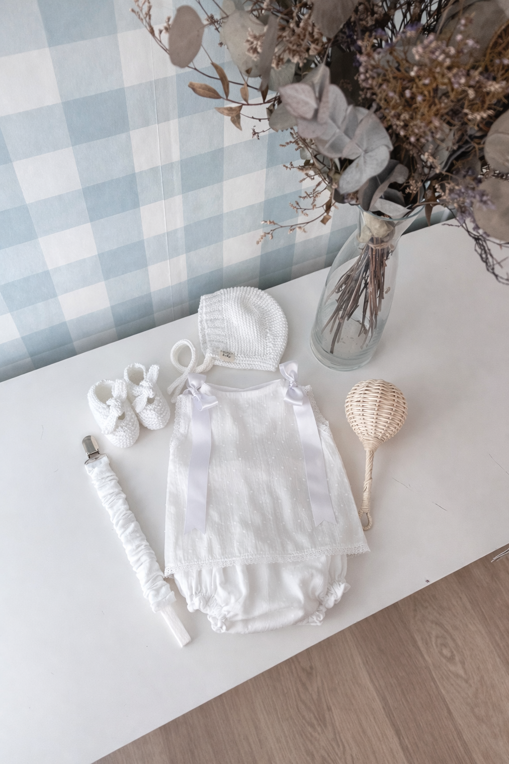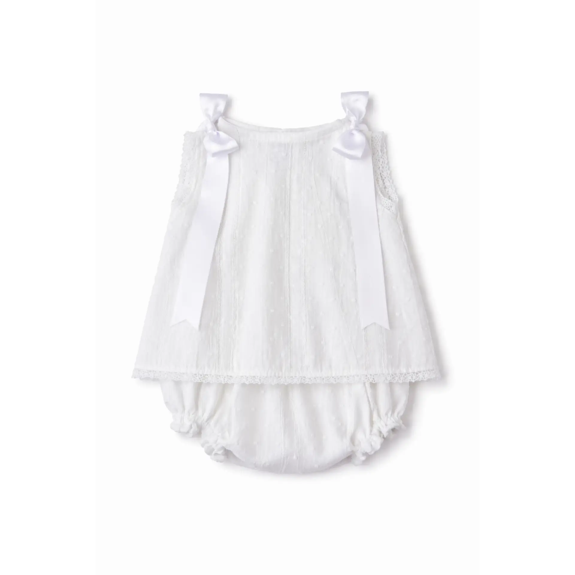 Jesusito con braguita en un batista con plumeti y brocado rematada con puntilla y lazadas en los hombros en el color a elegir. Una prenda perfecta para primera puesta, ideal para combinar con punto debajo o sin nada en los meses más cálidos.