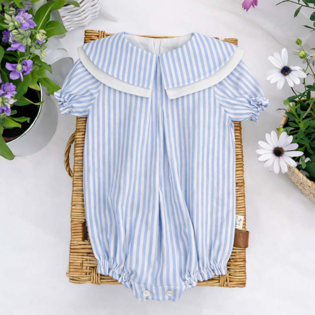 Pelele Begur con cuello doble en batista blanco y rayas azules.