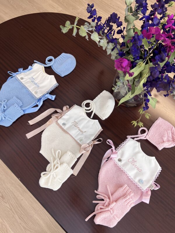 Pelele combinado en punto y piqué crudo personalizado con el nombre de tu peque. Una prendas muy especial perfecta para combinar con punto debajo en los meses más fríos.