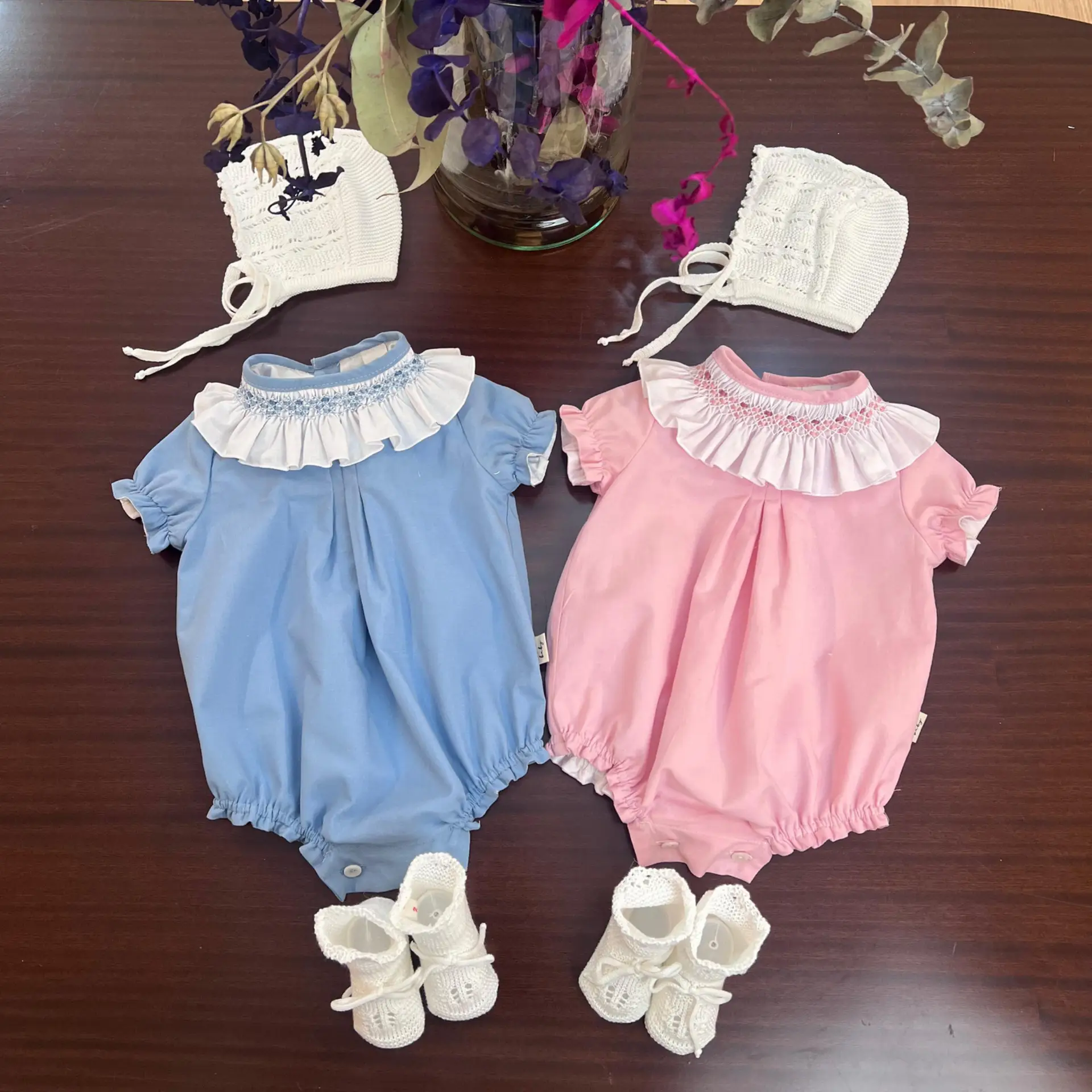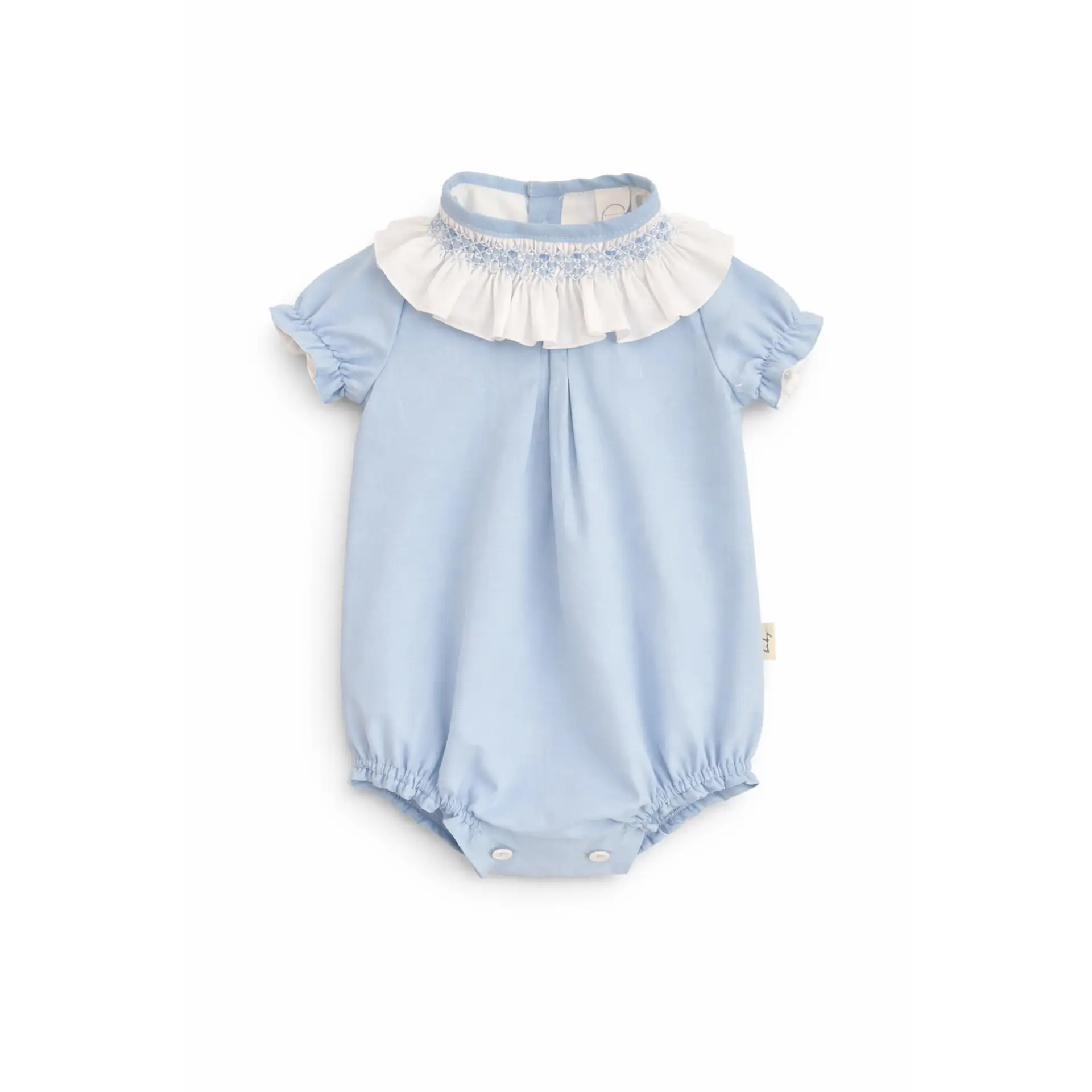 Pelele en batista rosa palo con cuello en batista blanco bordado a mano en punto smock en tonos rosas. Abotonado por la espalda y la entrepierna para facilitar el cambio del pañal. Un modelo ideal para niña, super comodo y muy especial.