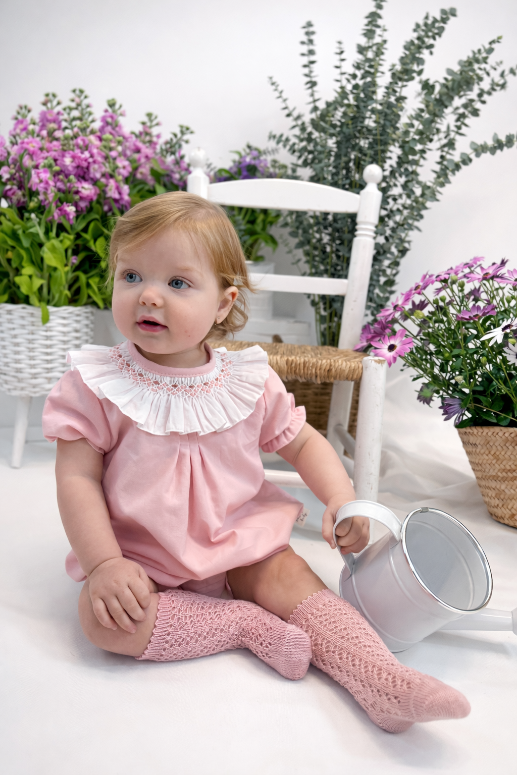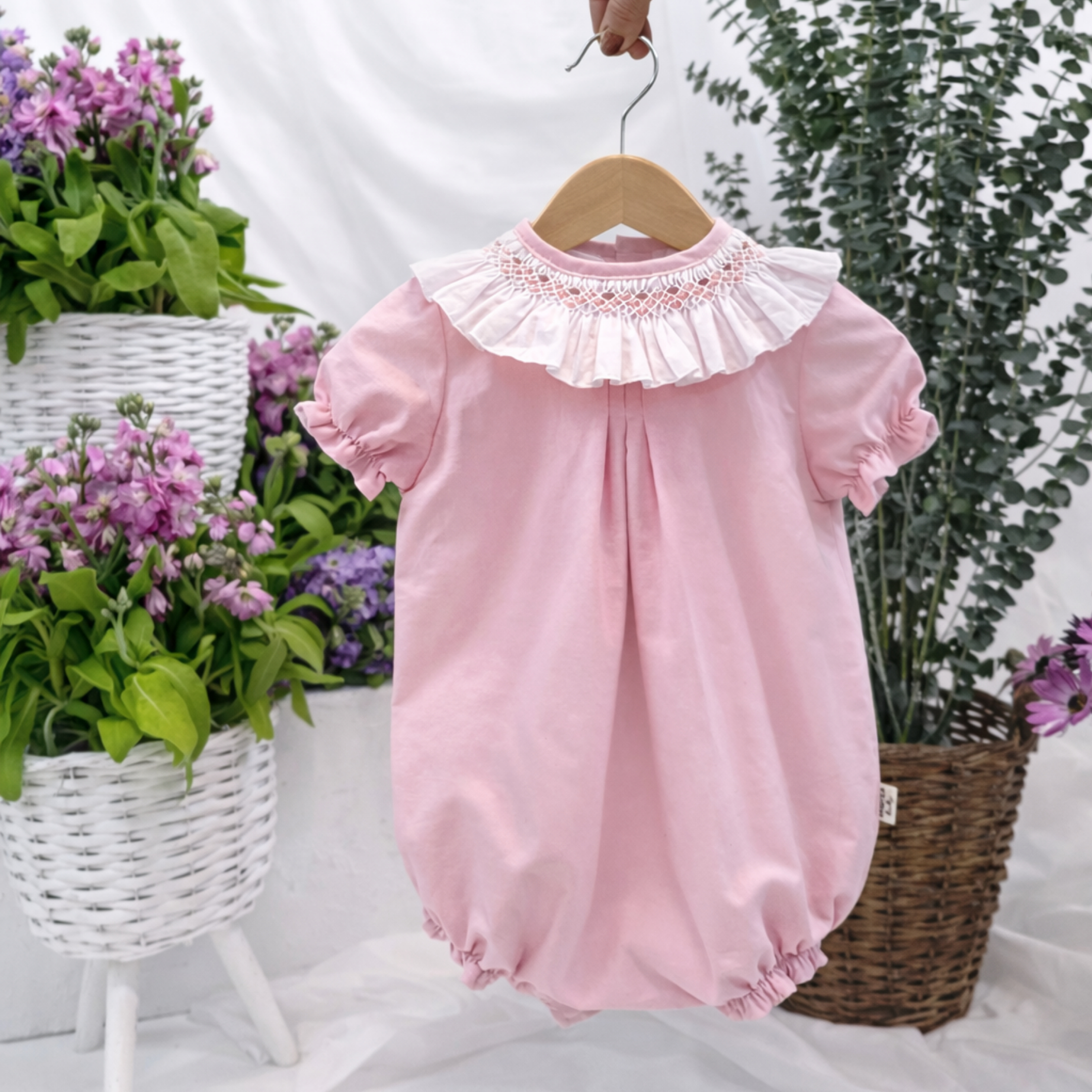 Pelele en batista rosa palo con cuello en batista blanco bordado a mano en punto smock en tonos rosas. Abotonado por la espalda y la entrepierna para facilitar el cambio del pañal. Un modelo ideal para niña, super comodo y muy especial.