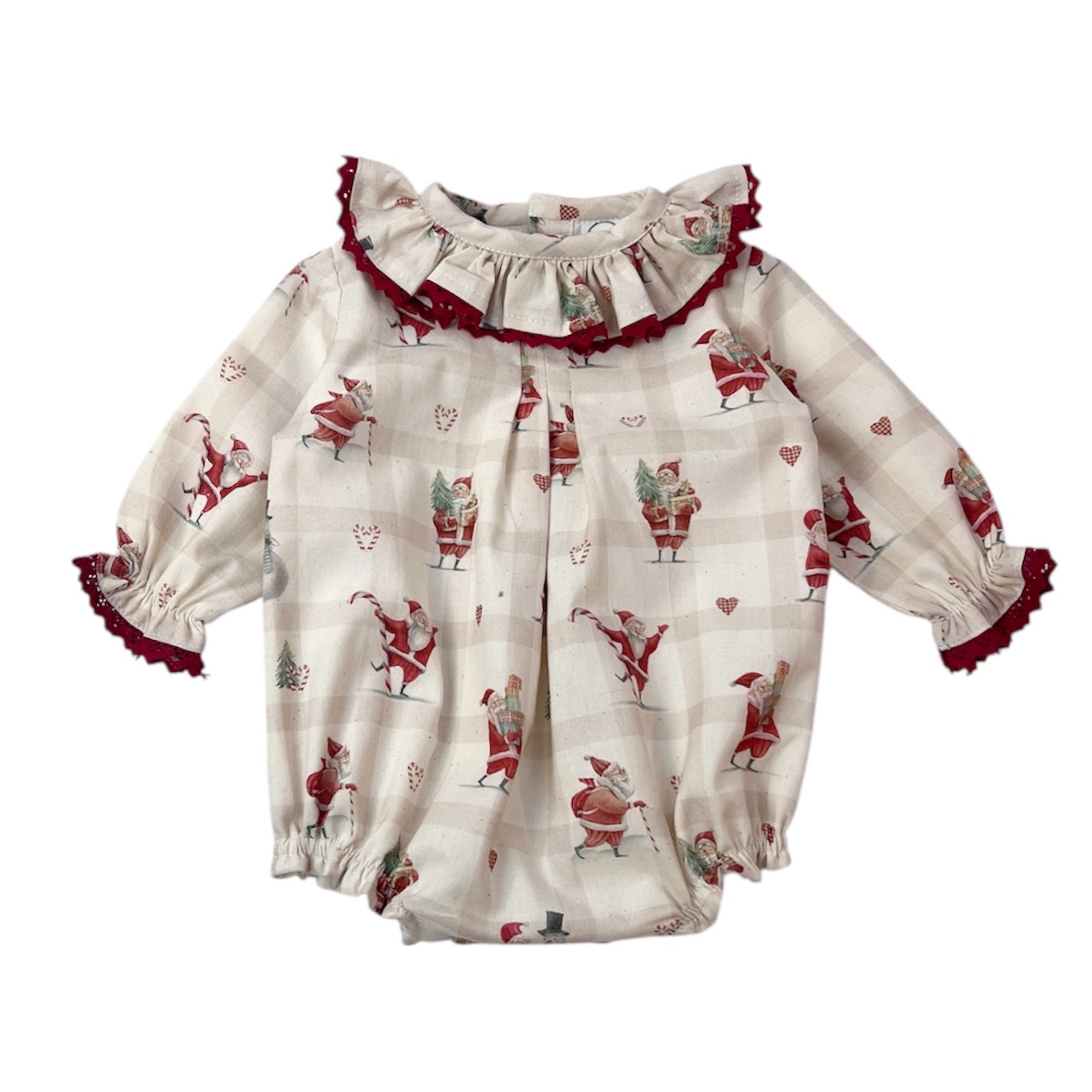 Pelele en tejido Santa con cuello volante rematado con puntilla al tono en cuello y puños, una prenda totalmente unisex con la que tu peque estará ideal estas navidades!