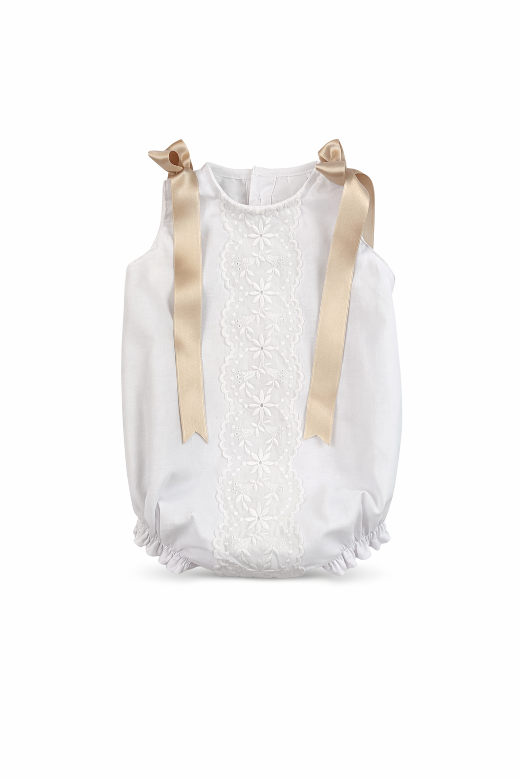 Pelele en batista blanca con blonda central y lazadas de raso a elegir. Uno de nuestros modelos favoritos, perfecto para llevar con punto debajo.