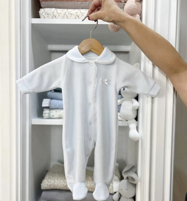 Pijama de terciopelo con cuello bebé. El interior  es 100% algodón y abotonado de arriba abajo para una mayor comodidad a la hora de cambiar el pañal.