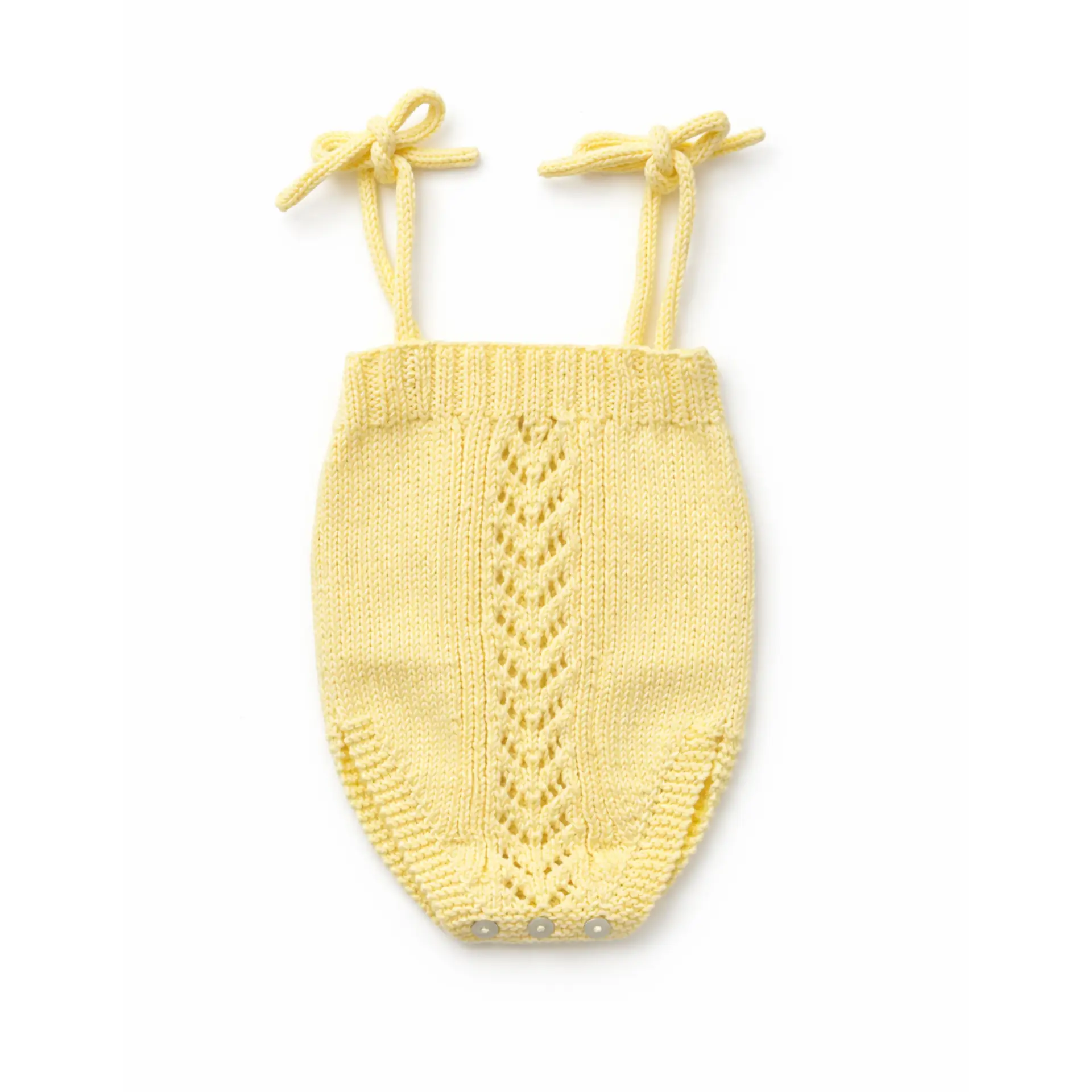 Ranita alta con lazadas a modo de tirantes, este modelo lleva un dibujo calado central, un modelo tejido a mano en hilo de algodón 100%, completamente unisex y con apertura en la entrepierna para facilitar el cambio de pañal.