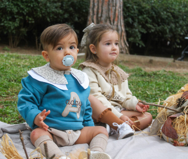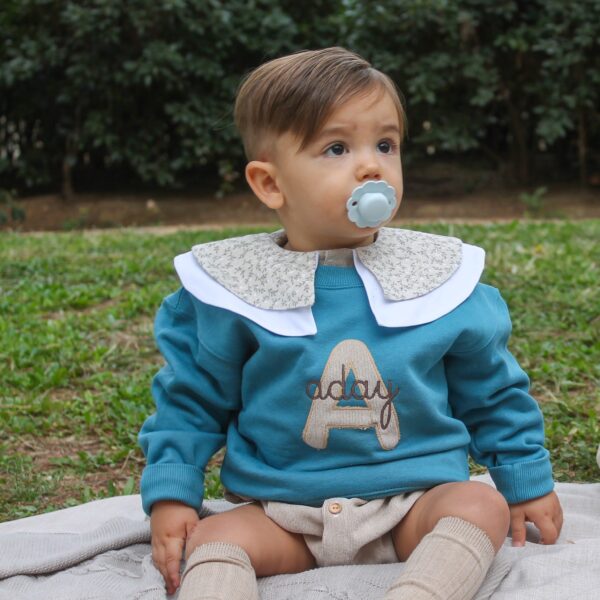 Sudadera en color azul empolvado personalizada con la inicial y nombre de tu peque. Combina la micropana turrón con el bordado en marrón chocolate, perfecta para combinar con todas las prendas de la colección Siena.