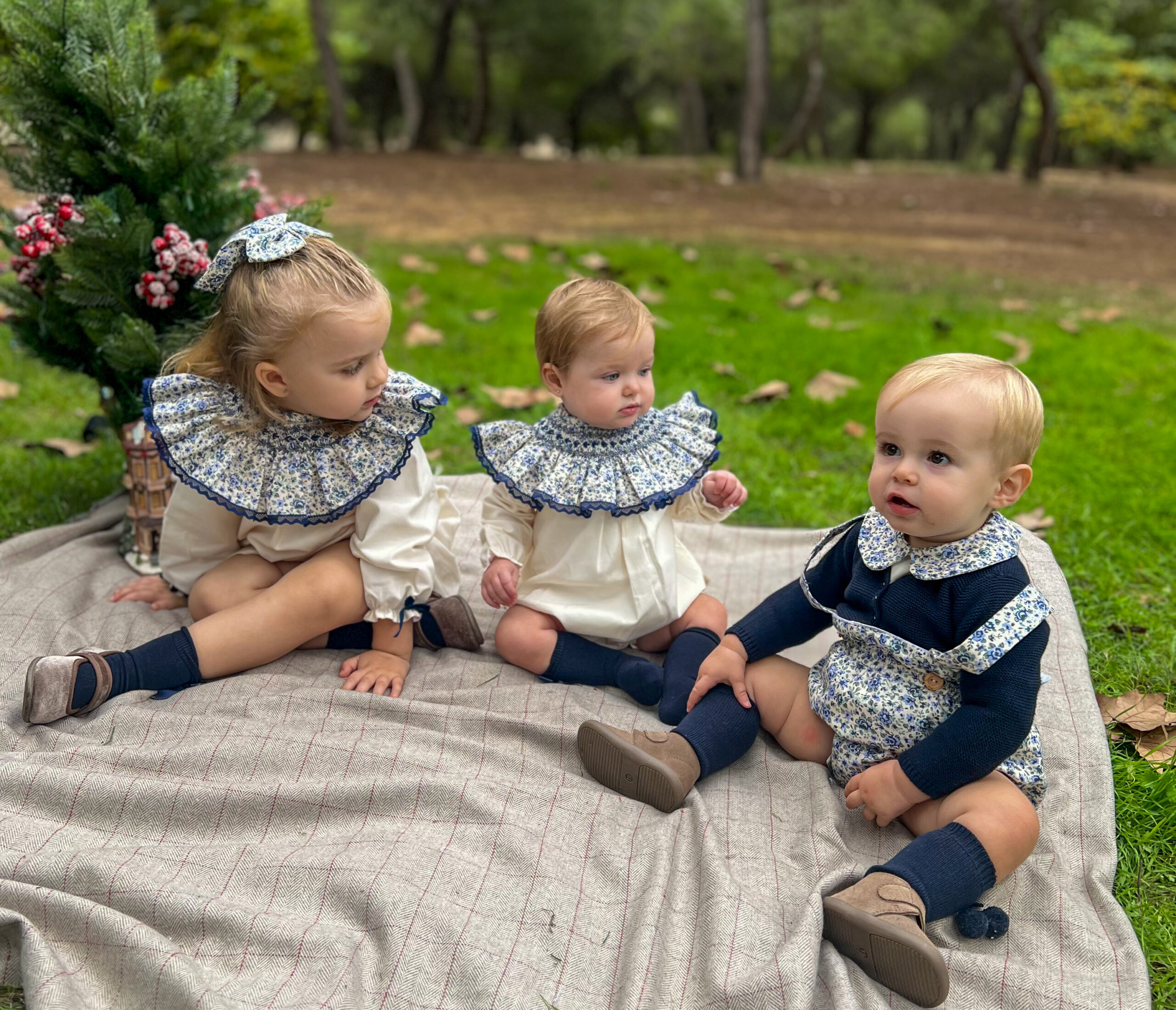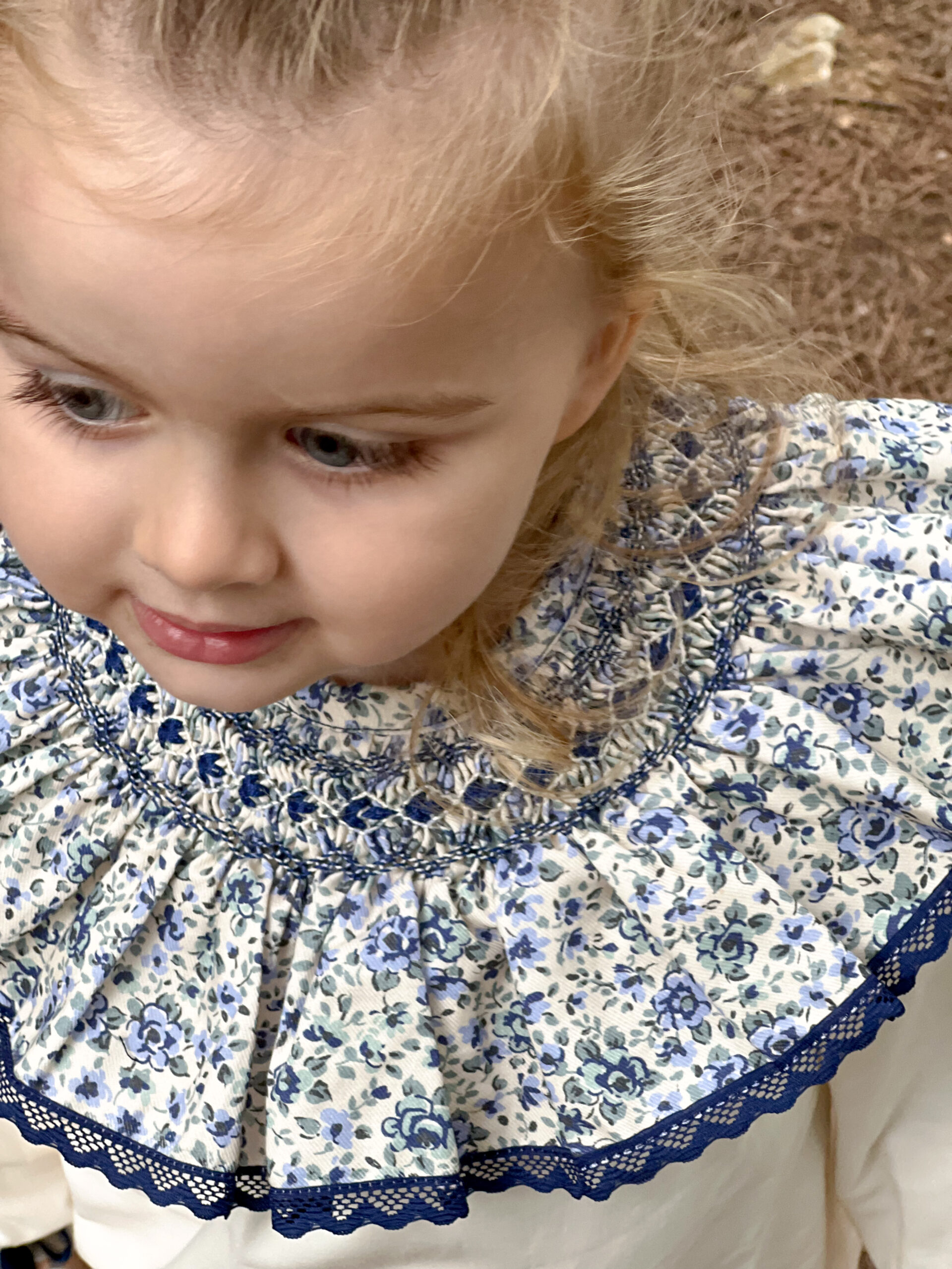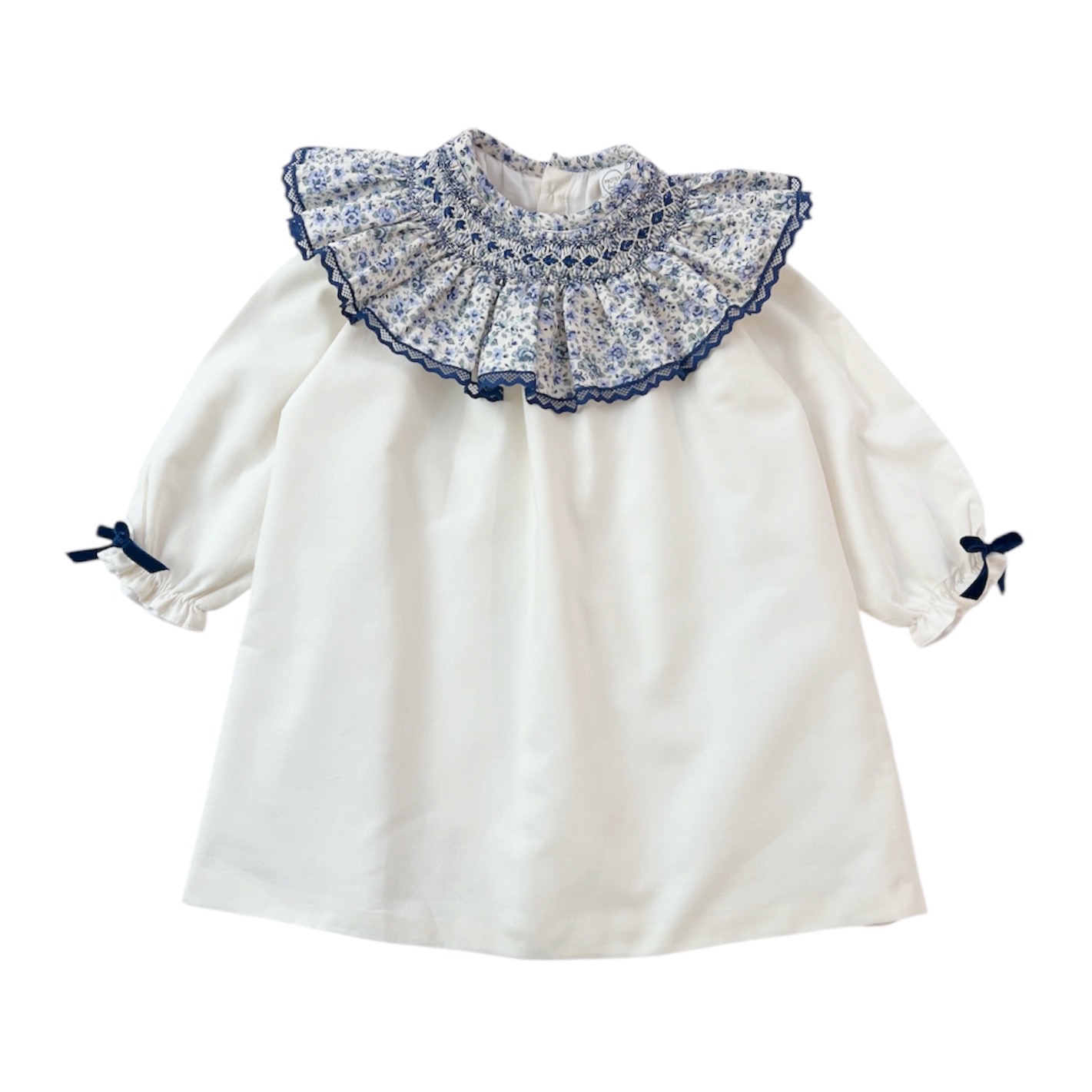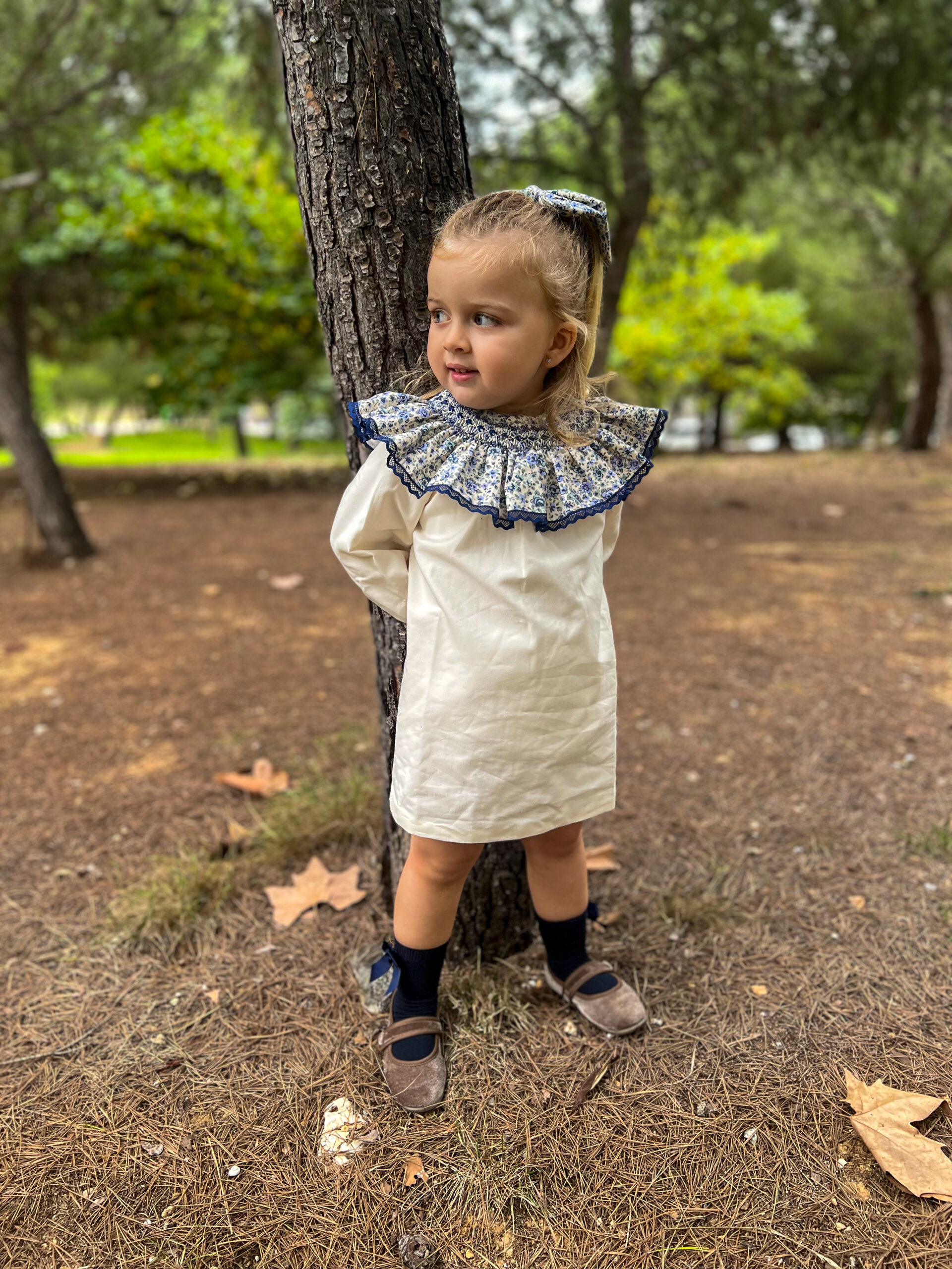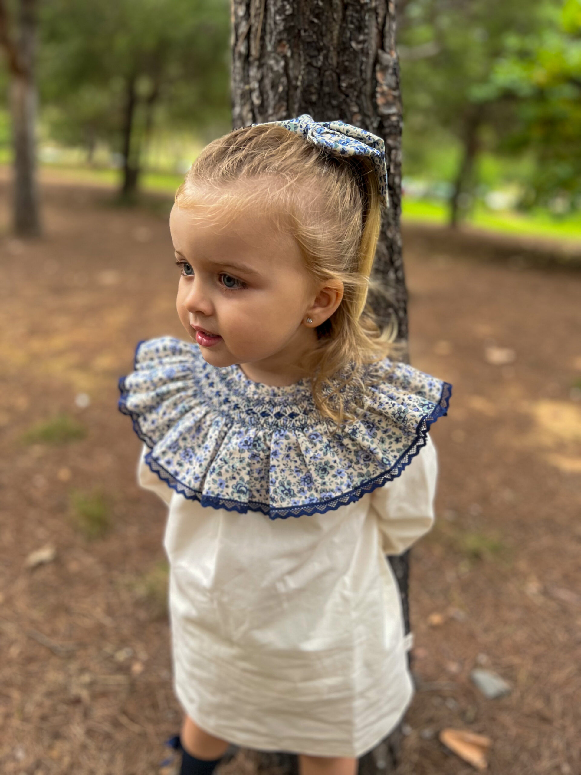 Vestido en batista cruda con cuello smock bordado a mano, combinando el estampado floral Lyon y el bordado en azul marino y crudo. La prenda tiene un patrón sencillo dándole todo el protagonismo el cuello, sin duda, un detalle que lo hace muy especial.